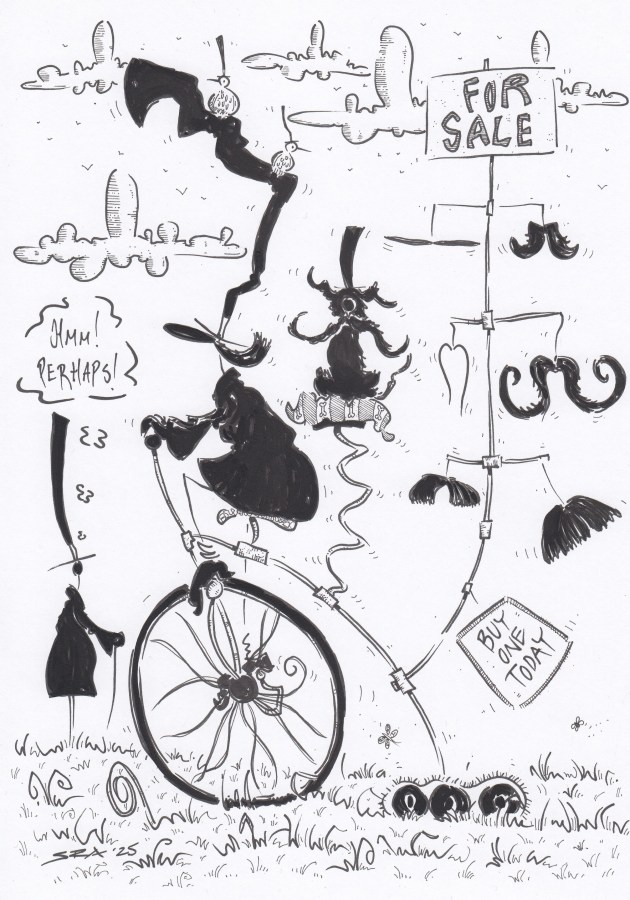 Gosh! Is it Inktober time again? This year Reg and Top Hat Man have decided to make their fortunes selling false mustaches. Do you have yours yet? There are lots to choose from. Please come back tomorrow to see how badly it’s going.
